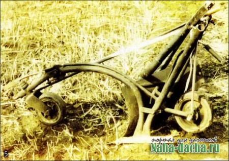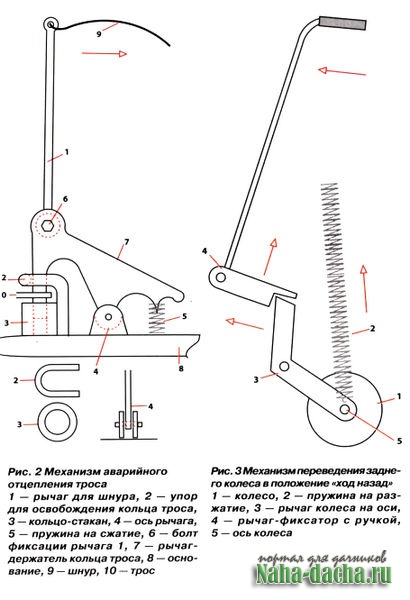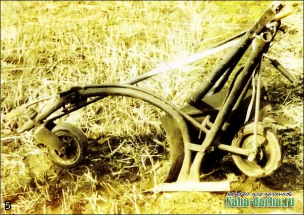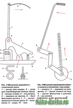 Следующим логическим шагом стало усовершенствование заводской модели плуга. После модернизации он «обзавелся» разборными ручками (фото 5), механизмами регулировки глубины вспашки, поворота и фиксации переднего (направляющего) колеса (фото 6), аварийного отцепления троса (рис. 2), перемещения плуга задним ходом от лебедки с помощью заднего колеса (фото 7, рис. 3).