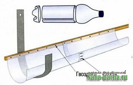 Чего только не делают из них умельцы! И кашпо, и декоративные пальмы, и разные украшения для дачи... Но это умельцы. Я, к сожалению, не из их числа, поэтому предлагаю соорудить из бутылок, может, не слишком изящную, но очень полезную конструкцию -водосточный желоб.