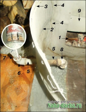 На резьбовом конце патрубка проделал несколько продольных пропилов на всю длину резьбы (см. фото). Чем сильнее вкручиваю его в муфту, тем меньше поступает воздуха в топку, поскольку величина пропилов, через которые поступает воздух, о результате сокращается. Чтобы воздух, необходимый для горения дров, поступал подальше от крышки и топливо горвло равномерно, обрезок трубы (5) ввел на 20 см в топку и накрутил Г -образный отвод (8) свободным отверстием вниз.