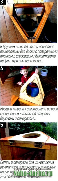 «ТРОН» ДЛЯ ПУДР-КЛОЗЕТА: ОСНОВНЫЕ ТРЕБОВАНИЯ К КОНСТРУКЦИИ• Гигиеничность. Важно предусмотреть возможность периодически выносить «трон» на улицу для тщательной мойки с использованием воды под давлением. Следите, чтобы ручка ведра с отходами всегда была чистой. При извлечении ведра надо избегать ситуаций, при которых можно испачкаться.
