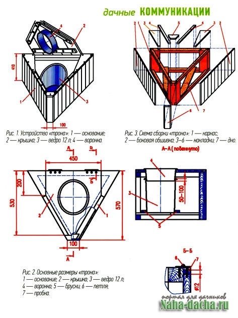 Основные размеры, обеспечивающие удобство пользования данным изделием, даны на рис. 1 и рис. 2. «Трон» представляет собой основание 1 и откидывающуюся крышку 2. На дне основания устанавливается ведро 3, а в крышке — воронка U, входящая в верхнюю часть ведра. Воронка, изготовленная из ведра объёмом 10 л, и ведро для нечистот объёмом 12 л подобраны таким образом, чтобы средняя часть меньшего ведра свободно входила в верхнюю часть большего ведра.