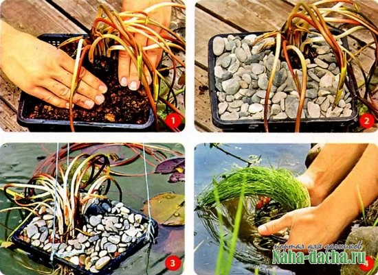 4 Аккуратно опустить корзину с растением в воду. Если водоем глубокий, надо поставить емкость не на дно (зелень должна быть над водой), а на камни или кирпичи, а потом, по мере того как растение будет вытягиваться, постепенно убирать подставку.