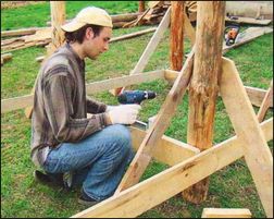 Так как навес мы строили не на века, фундаментов и даже опорных площадок под столбы делать не собирались. Более того, сами столбы никакими защитными средствами не обрабатывали — всё равно потом пойдут на дрова. Поставив поочерёдно первую пару столбов просто на землю, выверили их по вертикали с помощью уровня и зафиксировали каждый в таком положении наклонными подпорками. Выкроив из доски сечением 50x150 мм перемычку длиной 1,2 м, соединили ею столбы внизу на высоте примерно 30 см от поверхности фунта. Для этого, закрепив конец перемычки саморезом на одном из столбов, выставили её верхнюю