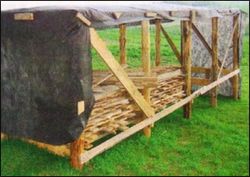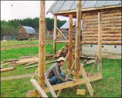 Тратить деньги на временное сооружение не хотелось. Поэтому собрали оставшиеся после строительства дома обрезки досок, а для несущих столбов взяли 10 коротких неошкуренных брёвен, которые использовались когда-то в качестве подкладок под брёвна завезённого сруба. Чтобы не приманивать к себе на участок короедов и древоточцев из соседнего леса, кору с брёвен-заготовок предварительно всё-таки сняли.