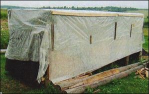 Опиленные верхние торцы столбов соединили перемычками, на которые просто продольно уложили (чтобы не портить) 4 «кровельные» доски. Они удержат кровлю навеса от сильного провисания. В качестве основного кровельного покрытия была выбрана толстая полиэтиленовая плёнка. А чтобы она дольше простояла под нагрузками от дождя, ветра и может быть снега, под неё настелили плотный укрывной материал, который обычно используют для защиты грядок и разных насаждений.