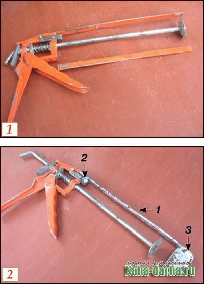 В качестве основы струбцины использовал скелетный пистолет для герметиков. Отрезал нижнюю длинную полоску (фото 1) и приварил к верхней, тем самым ее усилив (фото 2 п. 1). Изготовил скобу из металла толщиной 1,5 мм и шириной 6 мм и закрепил ее одним концом на корпусе конструкции с помощью двух винтиков d 3 мм, а другой конец приварил к пластине (2), увеличив жесткость соединения.