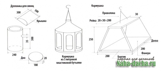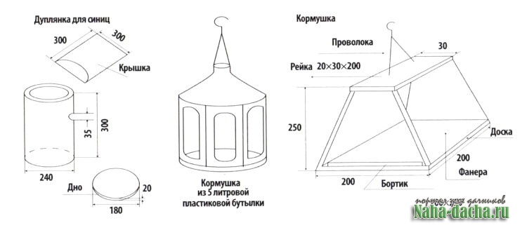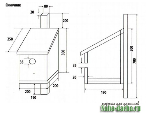Из рисунка понятно, как сделать синичник и кормушку. Домик делаю из досок толщиной 20 мм, без щелей, так как в синичнике должна поддерживаться постоянная температура. Возле домика на кустиках советую развесить в пучках шерсть собаки, козы, овцы или других животных - это будет лучшей приманкой для устройства гнезда.
