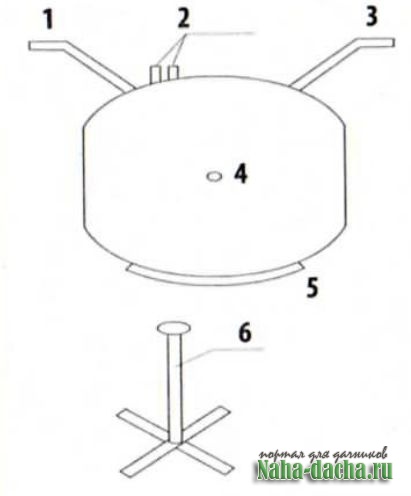 Болгаркой делаем поперечный распил крышки и дна кожуха, затем продольный распил оставшейся части и освобождаем внутренний бак. Удаляем теплоизоляцию (это делается легко) и приступаем к его модернизации. Снимаем соединительную муфту и обратный клапан с двух патрубков (2) и укорачиваем их болгаркой до 3-5 см: они служат для сообщения внутренней полости с атмосферой. Ручка (1) - приваренный изогнутый кусок металлической трубы или прутка. Боковые оси (4) в количестве 2 шт. - куски водопроводной трубы диаметром 25 см, длиной 3-5 см. Они привариваются противоположно, чуть выше центра бака и служат его опорой на ножках. На их концах сверлим отверстия для фиксации ножек. Заплатка (5) -приваренный кусок металлической пластинки для предотвращения пригорання днища бака - чем она толще, тем больше срок службы изделия. Ножки (6) имеют крестообразное основание из металлических обрезков труб (полос, уголков, прутков и т.п.) и стойку (высота и диаметр по желанию) из металлической трубы. На ее верхнем конце привариваем кольцо диаметром 32 мм (отпиливаем от водопроводной трубы).