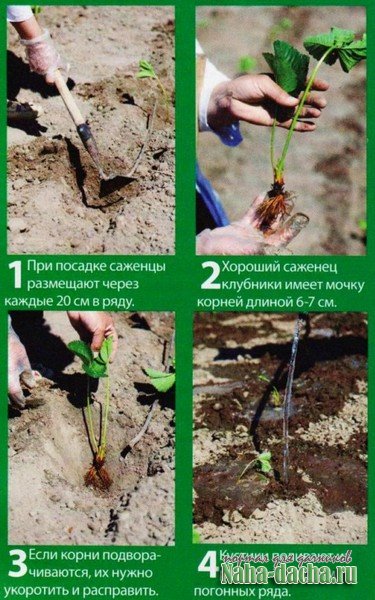Высаживают клубнику в апреле - начале мая и в середине августа - середине сентября. Лучше высаживать рассаду рядами. Расстояние между рядами - 50-60 см, между растениями -15-20 см. Тропинки для ухода - через 2 ряда.