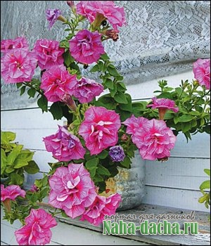 Ампельные сорта обязательно выращиваю в «подвесе», и тогда побеги петунии, сплошь усыпанные цветками, красиво спускаются вниз настоящим водопадом. Эти петунии прищипывать не надо, у них и так вырастает достаточное количество боковых побегов, на которых появляется большое количество цветков. Основное условие для красивого цветения - ампельные сорта петуний сажать по одному растению в горшок объемом не меньше 10 л! И очень важен свет - на солнце цветение обильное, роскошное, в тени же побеги быстро вытягиваются, одревесневают, цветки становятся бледнее и мельчают.