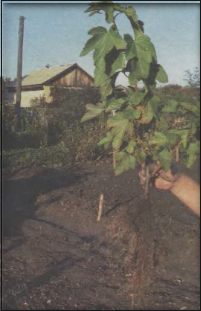 Втыкаю черенки в подготовленную грядку под углом 45° к продольной оси полосы на расстоянии 30 см друг от друга. Благодаря этому создаются хорошие условия для поступления к подземной части черенка влаги и воздуха, следовательно, создаются благоприятные условия для роста корневой системы. При вертикальной посадке черенка нижний конец будет находиться глубже в почве, где меньше тепла, воздуха и влаги, т.е. условия для развития корневой системы и роста черенка хуже.