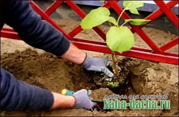 Киви высаживают в местах, защищенных от северного и северо-восточного ветра. Лучше всего с южной стороны дома. Предпочтительна весенняя посадка. Обычно сажают 5-6 женских растений на одно мужское. С учетом того, что у киви поверхностная корневая система, посадочную яму делают неглубокой: 0,5x0,5x0,5 м. Киви любят хорошо дренированные богатые гумусом почвы. Лучшим соотношением считается 1-2 части перепревшего навоза или компоста на 1 часть садового грунта. Желательно, чтобы корневая шейка была на 3 см выше уровня грунта, так как заглубленная посадка может привести к гибели растения.