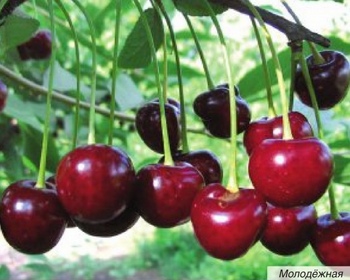 Молодёжная. Эта вишня низкорослая, кустовидного типа (2-2,5 м в высоту) с пониклыми ветвями. Сорт самоплодный, высокоурожайный, поздний. Зимостойкость и древесины, и цветочных почек высокая. Плоды крупные, массой 4-5 г, тёмно-бордового цвета, после созревания не опадают. Мякоть темно-красная, очень приятного сладковатого, без терпкости, вкуса.
