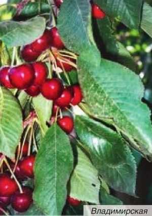 Владимирская - универсальный сорт (хорош как для переработки, так и для употребления в свежем виде), выведен ещё в XVIII веке, включен в Государственный реестр (по Северо-Западному региону) в 1947 году. В естественном состоянии (на собственных корнях) - это сильнорослый кустарник высотой от 2,5 м, привитый саженец формируют одноштам-бовым деревом. Плоды 2,5-3 г, тёмно-красные, плоскоокруглой или ре-повидной формы с плотной мякотью и кисло-сладким вкусом. Косточка небольшая, хорошо отделяется. Зимостойкость древесины вишни достаточно высокая, а цветковых почек - средняя, поэтому в суровые зимы они могут подмерзать. Созревание плодов происходит не одновременно, и по мере вызревания они осыпаются. Владимирская - самобесплодный сорт, но является хорошим опылителем для других. Очень хорошие урожаи можно получить при выращивании рядом Владимирской и Любской вишен.