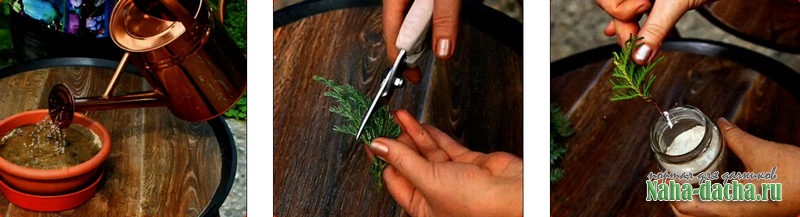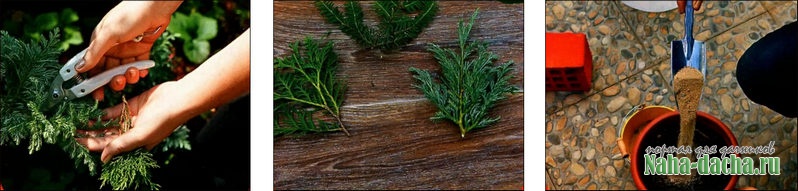 2. Вот так выглядят хвойные черенки. Размеры черенка разные: у туи, можжевельника, сосны - 8-12 см, у ели - 5-8 см, у тиса - 8-10 см.