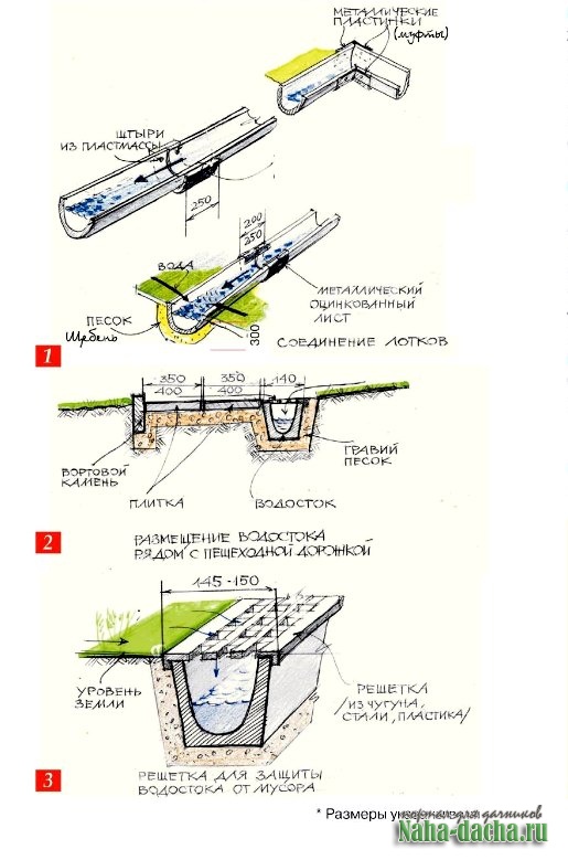 У пешеходных дорожек водосток делая со стороны уклона, предварительно убрав бордюрный камень (рис. 2)