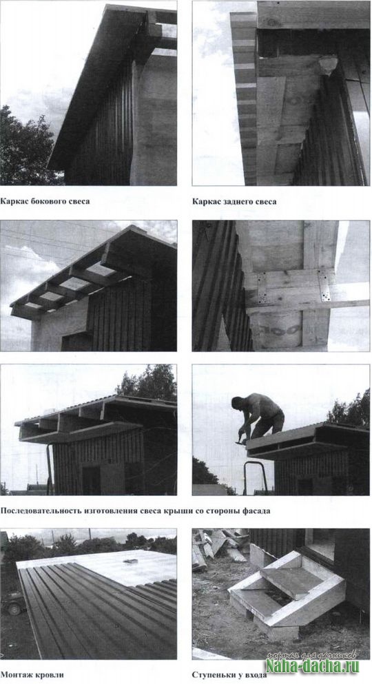 После возведения каркаса делался настил пола из старых 40-мм досок. Стропила крыши (под углом около 15° к горизонту) сделаны из брусьев сечением 100x50 мм, поставленных на ребро, а обрешетка - из цельных досок, но при наличии подходящих обрезков можно обойтись и ими. По всему периметру сделаны свесы. Такая крыша выдержит любой натиск стихии и толстый слой снега.