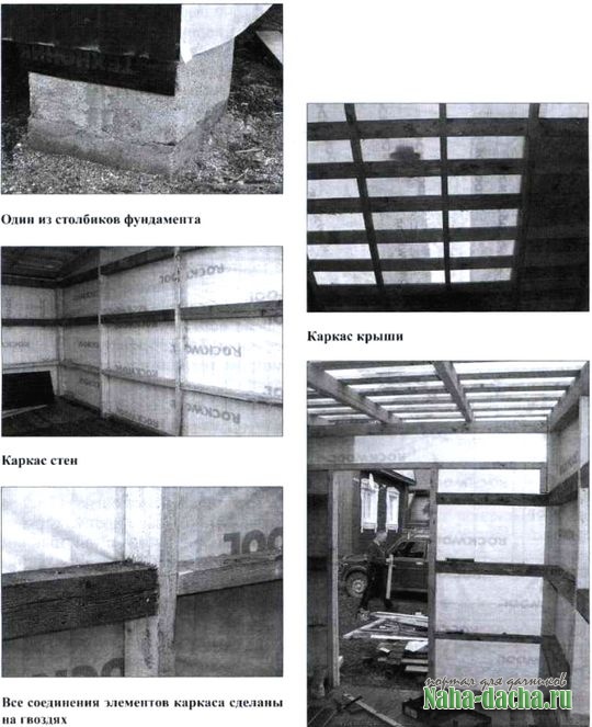 сечением 100x50 мм и 100x100 мм. Все соединения элементов каркаса - на гвоздях, забитых наискосок.