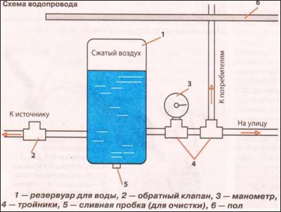 Почему емкость установлена вертикально? Потому что вода, подаваемая насосом, сжимает воздух, с помощью которого при заполненной системе и отключенном насосе можно из любого крана набрать 5-15 л воды (в зависимости от объема ресивера). Тем самым насос и контакты избавляются от частых включений.