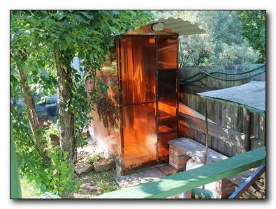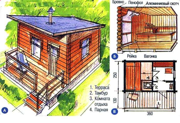 Окна бани лучше ориентировать на западную сторону. Планировка помещений проста и включает в себя самое необходимое: парную, комнату отдыха, небольшой тамбур, террасу-веранду для отдыха на свежем воздухе (рис. А, В). Таким образом, получаем габаритные размеры сооружения в плане: 3,80-4,0x3,6 м.