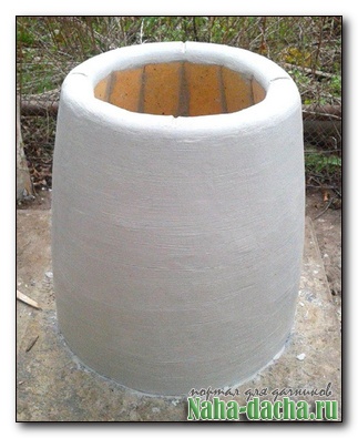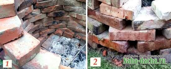 ■ Расчистил площадку и выложил на ней из кирпича круглое основание диаметром примерно 120 см. Затем приступил к выведению конструкции. Первых три кольца сложил полностью, по всему периметру. Следующие ряды выкладывал, убавляя кирпичи (фото 1), чтобы получился проем. Для экономии времени цементный раствор не использовал, а просто укладывал один кирпич на другой (фото 2)