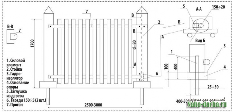 3a 27 лет я не заменил ни одной стойки, ни одного горизонтального прогона! Возведение забора осуществлялось в следующей последовательности (см. рис.).