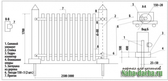 5. Соседние стойки связываются горизонтальными прогонами (поз. 7), и на них устанавливаются ограждающие элементы - сетка, доски, жерди и т.п.