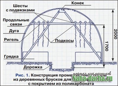 Как показал 6-летний опыт эксплуатации теплицы, конек опоры удерживает каркас от продавли-вания сверху, а ригель уменьшает боковое сдавливание под воздействием снеговой нагрузки. Даже пленку снимать не нужно. Летом же на ригеле можно крепить жерди или проволоку, к которым удобно подвязывать кусты томатов, огурцов.