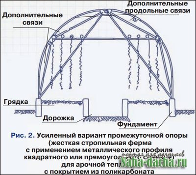А вот в регионах, где высота снежного покрова превышает 1 м, я бы советовал дополнительно укрепить А-образную опору, так как это показано на рис. 2. Если соединить все места стыков промежуточной опоры с дугой теплицы при помощи плоских пластинчатых скобок и накладок и добавить дополнительные связи, то в результате получим жесткую стропильную ферму, обеспечивающую прочность и устойчивость теплицы при воздействии любых снеговых нагрузок.