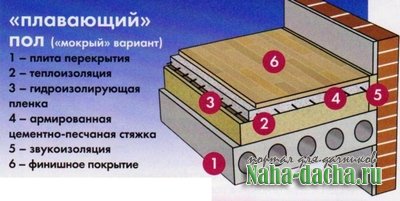 Обеспечить комфортную температуру поверхности пола и защитить себя от звуков поможет изоляция пола. Наиболее простым способом тепло-и звукоизоляции пола на железобетонной плите является устройство «плавающего» пола. Заранее выравнивают основание (насыпают слой песка, укладывают цементно-песчаную стяжку или заливают самовыравнивающуюся смесь). Затем на подготовленное основание плотно без зазоров укладывают плитную теплоизоляцию. Укрывают ее полиэтиленовой пленкой и заливают цементно-песчаной стяжкой толщиной не менее 4 см, с армированием или самовыравнивающимся раствором. Слои, лежащие на изоляции, не должны иметь жестких связей с несущим перекрытием и примыкать вплотную к стене, потому по периметру помещения оставляют воздушный зазор шириной 1-1,5 см, который впоследствии заполняют вспененной лентой или изоляционными прокладками.