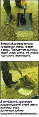 В нашем случае для возведения подпорной стенки-клумбы потребуется относительно небольшое количество бетона. Раствор замешивают в соотношении 1:5 (2 совковые лопаты цемента и 10 таких же лопат наполнителя, состоящего из 3 частей песка и 7 частей гравия). В куче подготовленной смеси делают углубление, в которое наливают воду. Эту массу тщательно перемешивают. Слишком много воды добавлять не следует, иначе раствор получится жидким.
