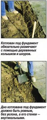 ПОДГОТОВКА ФУНДАМЕНТАУже при выемке грунта требуется точная разметка, иначе будет трудно выдержать прямые углы между отдельными стенками сооружения. Для этого вдоль будущего края котлована натягивают шнур. Стенки котлована должны быть ровными.