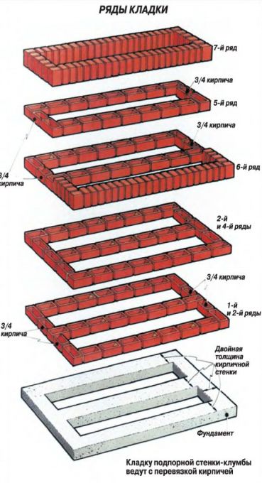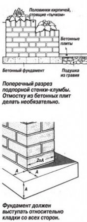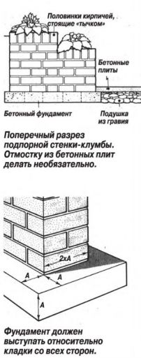 Стены клумбы надо возводить на фундаменте. Размеры его определяют по размерам кирпича. Фундамент должн быть в два раза шире толщины выложенной на нём стенки. Кирпичную кладку следует располагать на фундаменте симметрично от его краёв. Глубина фундамента должна быть равна ширине его выступов.