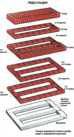 Если толщина кладки — 120 мм (при размере кирпичей 250x120x65 мм) ширина фундамента составит 2x120=240 мм. То есть, с каждой её стороны фундамент будет выступать на ширину -6 см. Такой же выступ фундамента должен быть и в торце кладки. Глубина же фундамента должна быть не менее 12 см.