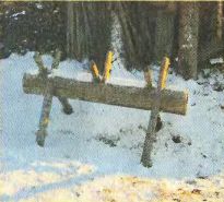 ■ Колоть дрова станет намного удобнее, если в землю врыть несколько коротких бревен, между которыми выкопать лунку. В нее ставят чурбаки (можно 2-3) и раскалывают. Держать чурбаки не надо, так как поленья не разлетаются. Зимой такое приспособление можно наморозить из бревен, снега и льда.