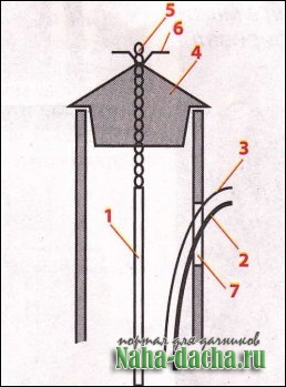 Рис. 2 «Головка» трубы 1 — шнур подвески, 2 — шланг, 3 — электрокабель, 4 — пробка, 5 — цепочка с узелками, 6 — стопор, 7 — «окно» в трубе.