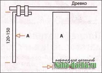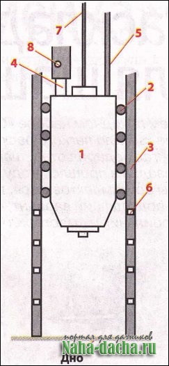 (рис. 1). Вплотную к стенке прикрепил скобами металлическую трубу: нижний конец опустил на дно, верхний не довел до уровня земли примерно на 2,5 м и закрыл дубовой заглушкой со сквозным отверстием d 12 мм по центру. В части, погруженной в воду, просверлил отверстия б 8 мм — для ее затекания