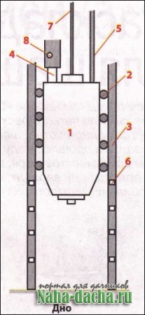 1 — насос, 2 — резиновые кольца, 3 — труба, 4 — патрубок для выхода воды, 5 — кабель, 6 — отверстия в трубе для поступления воды, 7 — подвесной шнур, 8 — сливное отверстие в шланге.