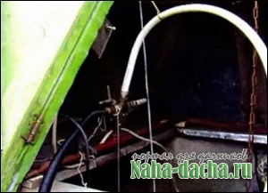 Но для изготовления водопровода нужно решить некоторые проблемы. Для начала нужно соединить насос с трубой таким образом, чтобы насос издавал как можно меньше шума во время работы. Если над колодцем имеется домик, расположенный на бетонном кольце колодца, а также настил из досок, который тоже опирается на это кольцо, то во время работы насоса все это сооружение будет издавать неприятное гудение. Чтобы его уменьшить, нужно погружной насос прикрепить к настилу из досок не напрямую - с помощью шнура, который входит в комплект к насосу, а прикрепить к этому шнуру отрезок резинового жгута или тонкого резинового шланга длиной около одного метра, и уже к нему крепить шнур от насоса. При этом шнур отрезать не нужно: в нужном месте на нем делается петля, и к ней прикрепляется конец резинового жгута. Остальная часть шнура свободно, без натяжения выводится на настил и там прикрепляется. Шланг от насоса крепится к распределительному устройству с помощью тройника.