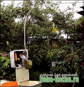 Сначала я предполагал, что использованная вода будет образовывать лужу в месте выхода резиновой трубы, и тогда свободный конец трубы придется укладывать на другое место. Однако вода, которая выливалась из трубы, полностью уходила в землю, и перемещать трубу не потребовалось. Для дачного водопровода я использовал погружной насос с верхним забором воды мощностью 250 Вт, металлопласти-ковую трубу диаметром 16 мм, суммарная длина трубы составляет 22 м. Бак из пищевой нержавейки был сделан на заказ. Размеры бака: 350x200x550. Емкость такого бака составляет около 40 л.