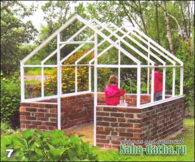 8. В завершение мы вставили стекла и установили водосточные желоба. Внутри теплицы мой муж установил по всему периметру широкий подоконник.