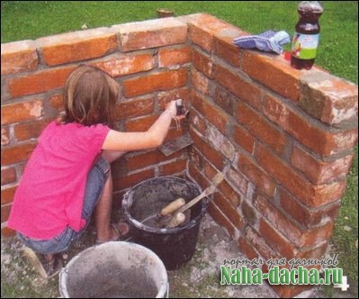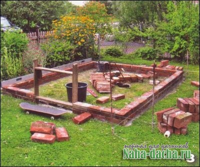 3. После того как фундамент высох, можно было при ступать к сооружению стенок. Для этого нам понадобились цементный раствор, кирпичи, строительный уровень, веревка и кельма. Старый клинкер нам достался от знакомых бесплатно. На месте будущей двери мы временно установили опалубку соответствующей ширины, сделанную из деревянных брусьев. Укладывая первый ряд кирпичей, необходимо натянуть на одинаковой высоте шнур-причалку, чтобы кладка была строго ровной. Время от времени мы проверяли прямолинейность с помощью уровня.