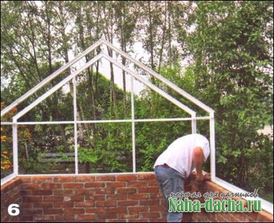 6. Сначала к кирпичной кладке мы по периметру прикрепили саморезами нижние профили. После этого на земле собрали все сегменты конструкции и лишь затем установили их.