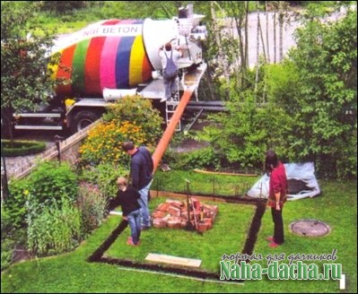 1. Начали мы, конечно же, с закладки фундамента. Муж выкопал траншею глубиной 80 см (глубина промерзания грунта) и шириной около 30 см. Самостоятельно делать раствор мы не захотели, поэтому заказали уже готовый. И как можно увидеть на фото, просто протянули трубу от бето номешалки к нашему объекту.