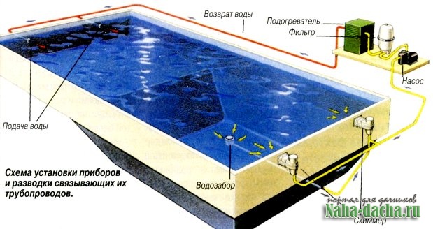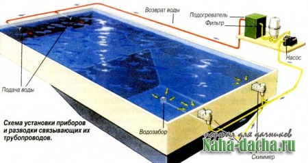 Схема показывает простой вариант разводки трубопроводов и размещения связанных ими приборов. Поскольку верхние слои воды подвергаются большему загрязнению внешней средой, должна быть обеспечена возможность отдельного отвода поверхностных слоев к фильтру. Эту задачу выполняют скиммеры. При включенных насосах уровень воды должен быть выше поплавковых клапанов ским-меров примерно на 15 мм. Вода циркулирует по трубопроводам, фильтруется и снова поступает в бассейн.
