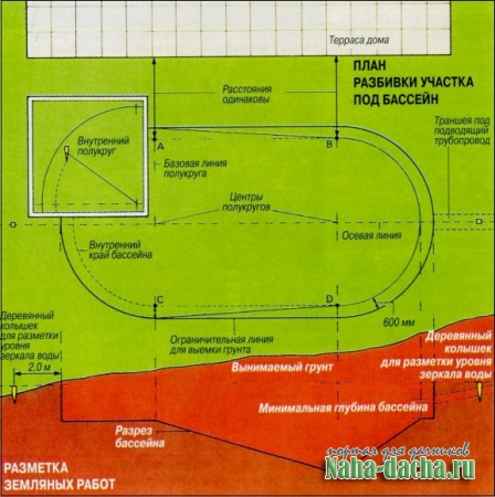Собрав достаточную предварительную информацию, следует выполнить детальный проект, например на миллиметровой бумаге. С помощью такого плана можно убедиться, что бассейн конкретной формы (очертания и разрез) точно разместится на отведённом ему месте участка. С его помощью можно также довольно точно произвести разметку земляных работ.