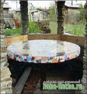 Когда беседка была готова, возникла идея как-то ее облагородить внутри, создать уют и комфорт. Супруга, Нина Павловна, предложила стол выложить мозаикой из обломков кафельной плитки, а я решил разместить в ней гамак...