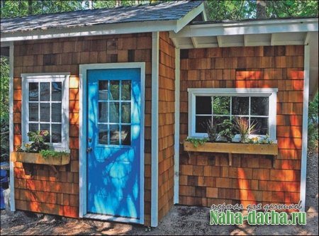 в гостях у сказкиХозяйственная постройка - отличный объект для творческих экспериментов хозяев. Немного фантазии - и обычный сарай может превратиться в сказочный теремок или причудливый замок. Причем совсем не обязательно сооружать конструкции сложных форм, можно оригинально оформить даже самый простой сарайчик: украсить стены забавными рисунками, деревянными резными элементами, декоративными рейками, подвесными кашпо с цветами, оригинальными фигурками. Особое внимание следует уделить входной группе и окнам. Здесь можно устроить опытные клумбы или рабатки для пробного выращивания диковинных цветов и растений. (При необходимости такую флору можно переселить в теплый домик.)