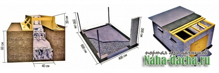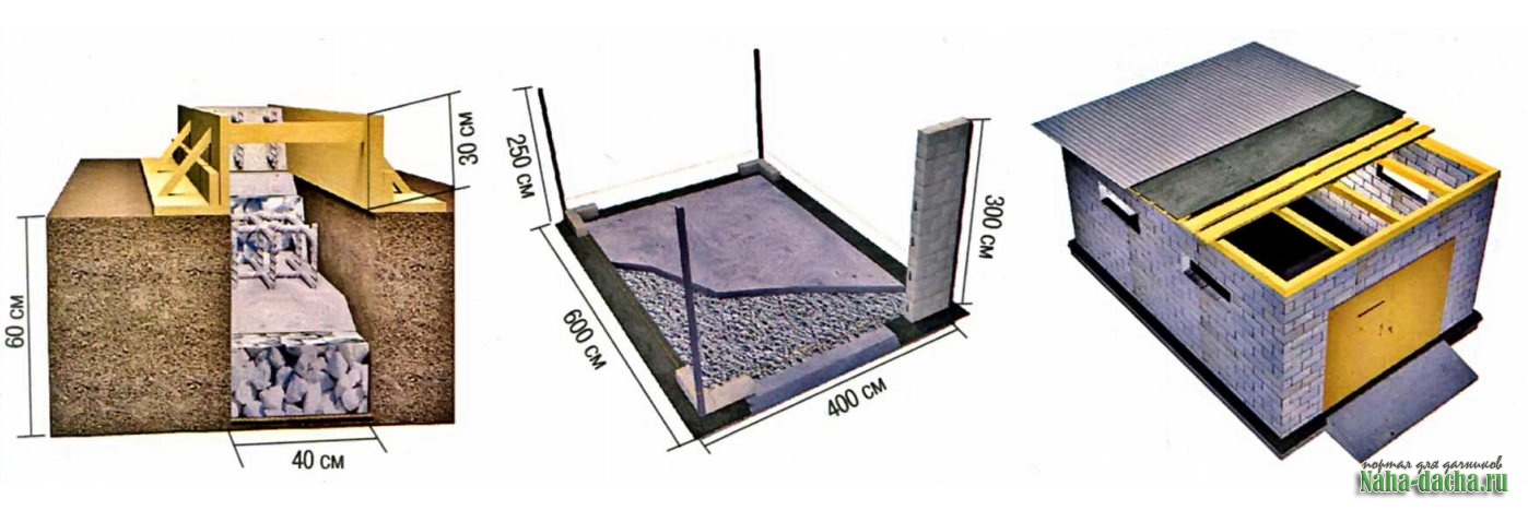 Часть забора, который находится со стороны улицы, пришлось демонтировать, чтобы разместить гараж. Расчистили площадку 4хб м. Вбили в землю по углам будущего строения деревянные колышки. Между ними натянули тонкий капроновый шнур. Далее выкопали траншею 40x60 см. Ее стенки аккуратно обработали лопатой, чтобы они были ровными. Затем уложили в траншею бутовый камень. Между несколькими слоями камня уложили арматуру. Каждую кладку проливали раствором цемента, смешанного с песком и водой, - до тех пор, пока слой бетона не сравнялся с поверхностью земли.
