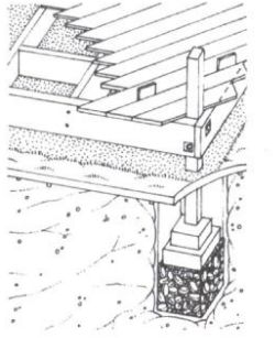 Палубный настил устанавливается на столбах, которые крепятся в земле с помощью бетонного основания.